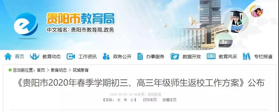 3月9日,貴陽市應對(duì)新冠肺炎疫情防控領導小組印發(fā)《貴陽市2020年春季學(xué)期初三、高三年級師生返校工作方案》的通知,通知中指出明确返校時間。除因疫情防控要求暫時不能(néng)返築的外,初三、高三年級全體教職員工于3月9日返校;寄宿制學(xué)校初三、高三年級學(xué)生于3月14-15日返校,3月16日正式上課。